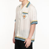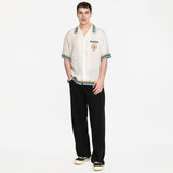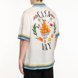 The Casa Way silk shirt boasts a print of the brand's iconic orange pyramid artwork, reimagined for this season with tennis rackets and blooming accents. It is adorned with a Casablanca label and contrasting details on the collar, cuffs, hem, and breast pocket, tailored to achieve a timeless fit.