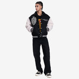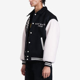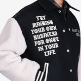 Saint Mxxxxxx x CPFM Varsity Jacket features bold embroidery, plush sleeves, and signature graphics. A standout streetwear piece blending luxury and rebellious style.