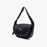 The Thug Club Dragon Messenger Bag features a textured black leather body accented with polished metal studs and signature TC emblem hardware. Designed with an adjustable grommet strap and a curved silhouette, this shoulder bag blends utilitarian edge with bold, statement detailing.